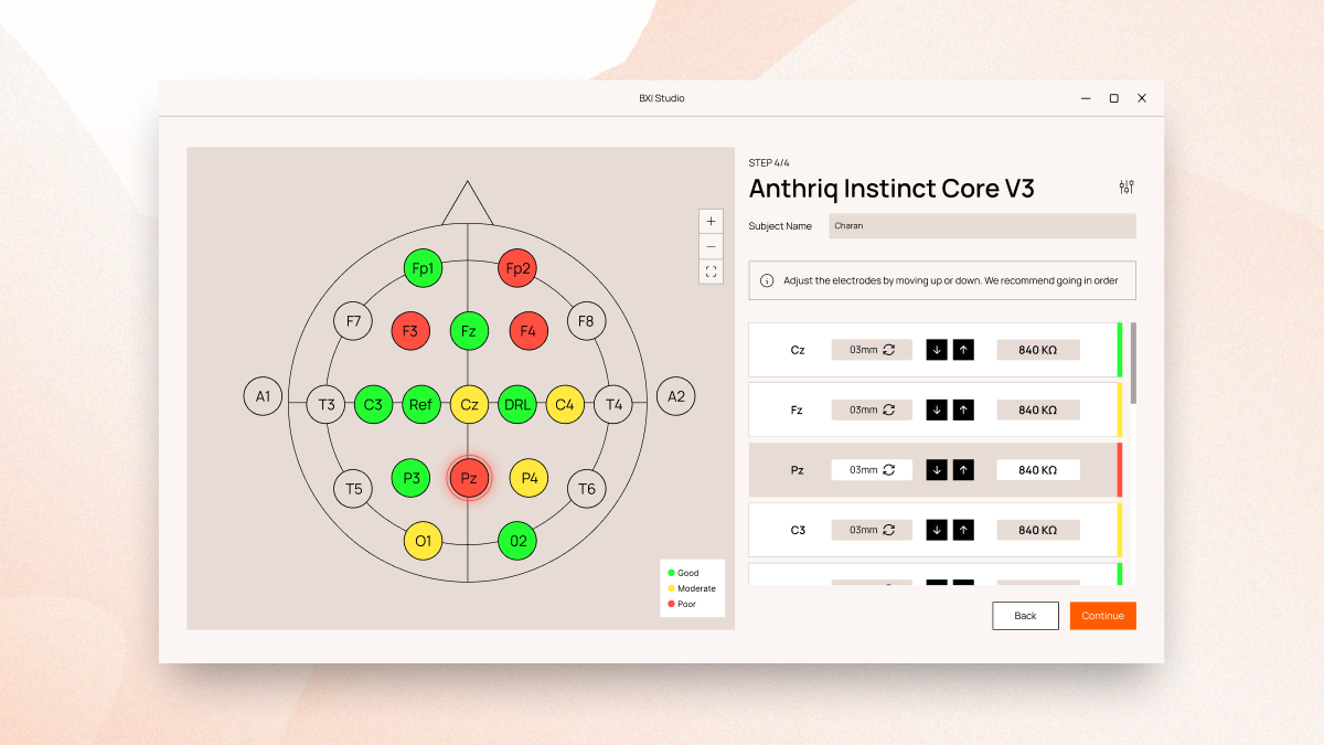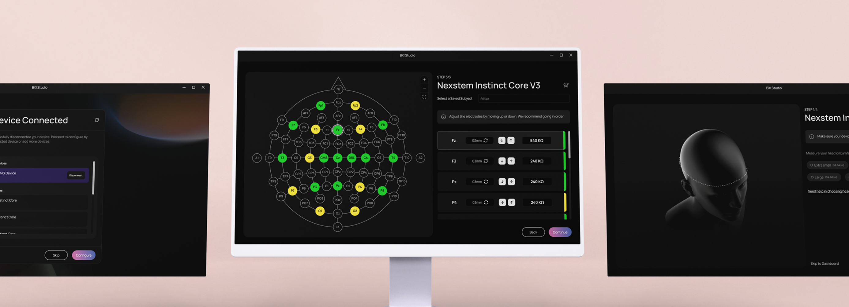 We support simultaneous pairing and management of multiple Instinct headsets, allowing you to run multi-participant studies or complex experimental configurations from a single interface. Each device maintains its own connection status, battery level, and signal quality indicators. Our curated onboarding flows guide you through device discovery, connection verification, electrode impedance checking, and signal quality validation.