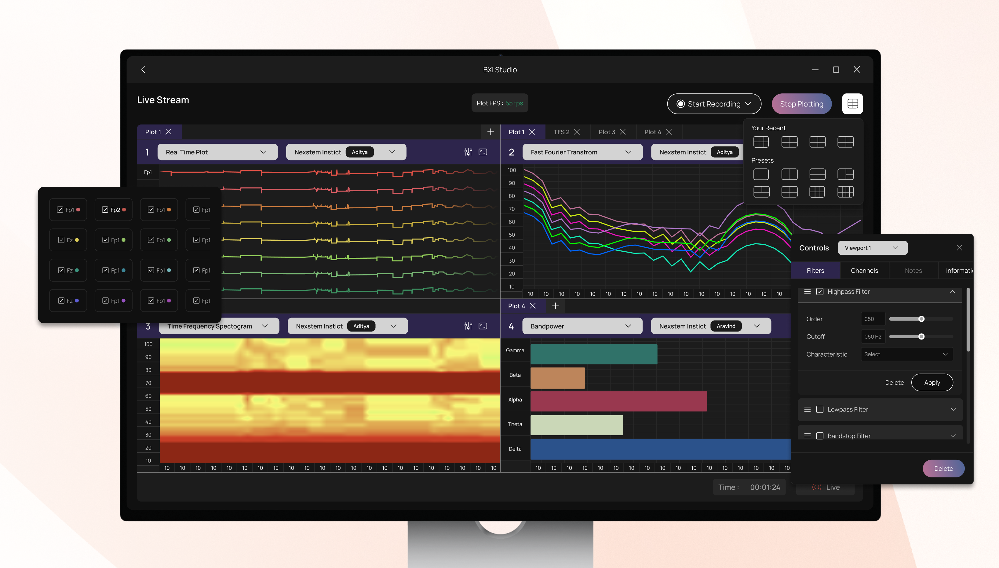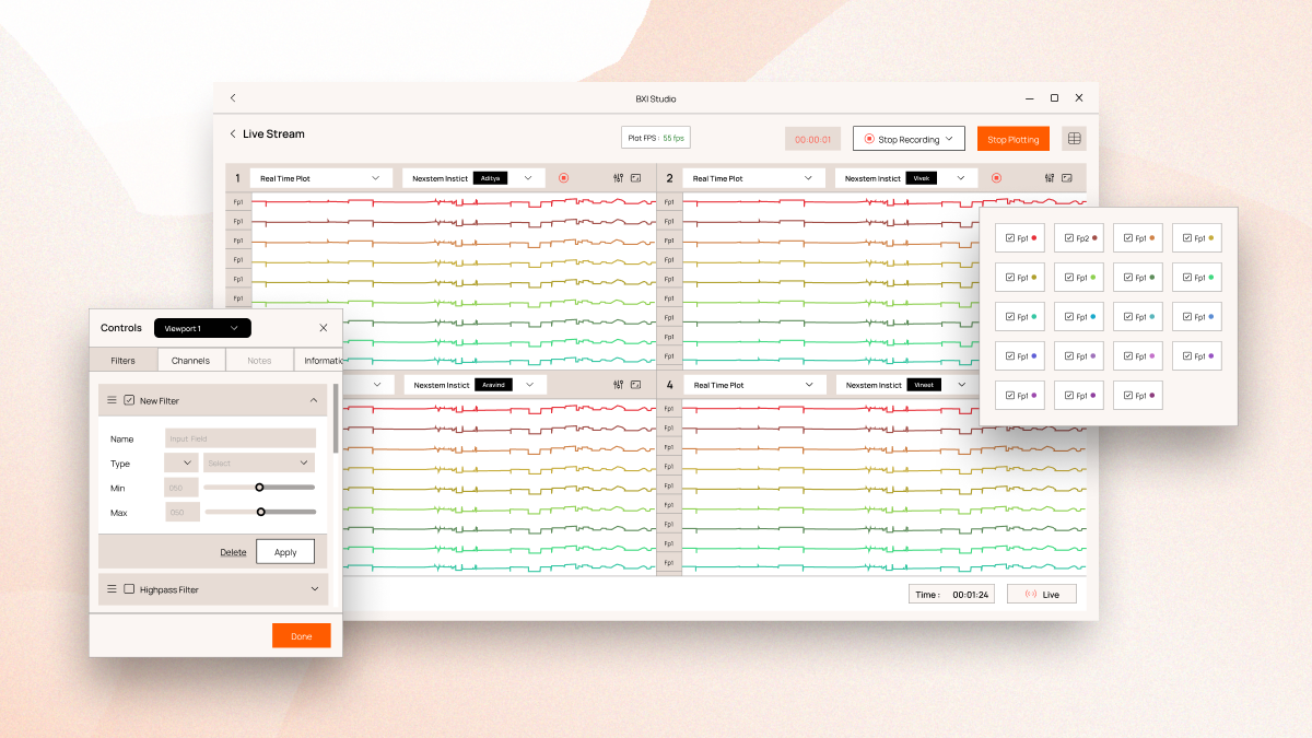 Streams brings your biosignals to life with real-time visualization and recording of EEG, EMG, ECG, and other biosignal data. We built this module to give you complete visibility into signal quality and recording control.
